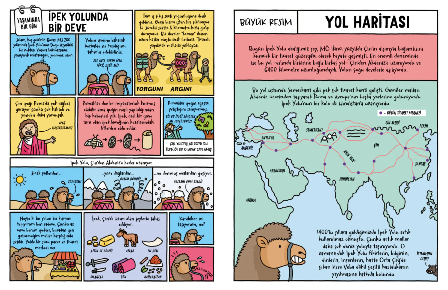Zamanda yolculuğa hazır mısın? Kayalara mamut resimleri çizen bir mağara insanı, kolezyumda dövüşen bir gladyatör, anne sözü dinlemeyen Vikingli bir genç ve uzaya giden ilk kadın… hepsi bir günlerinin nasıl geçtiğini bu kitapta anlattı. Sadece onlar mı! Antik Mısır’da tanrı yerine konulan bir kediden, 1500 yıl öncenin İstanbul’unda hipodromda koşturan bir yarış atına; Ayasofya’nın kubbesini süsleyecek bir yaprak altın varaktan, sonradan Mona Lisa’ya dönüşecek bir ahşap parçasına; Çin Seddi’nden, Shakespeare’in alkışlarla çınlattığı Globe tiyatrosuna; felsefecisinden marangozuna onlarca insan, hayvan, yapı ve eşya dile gelip tarihte iz bırakmalarını sağlayan bir günlerini bizimle paylaşıyor. Çizgi roman çizgi bilim ile birleşiyor, tarih hiç olmadığı kadar eğlenceli hale geliyor. O kadar eğlenceli ki, dünya tarihi hakkında bunca şeyi ne ara öğrendiğini anlayamayacaksın.
